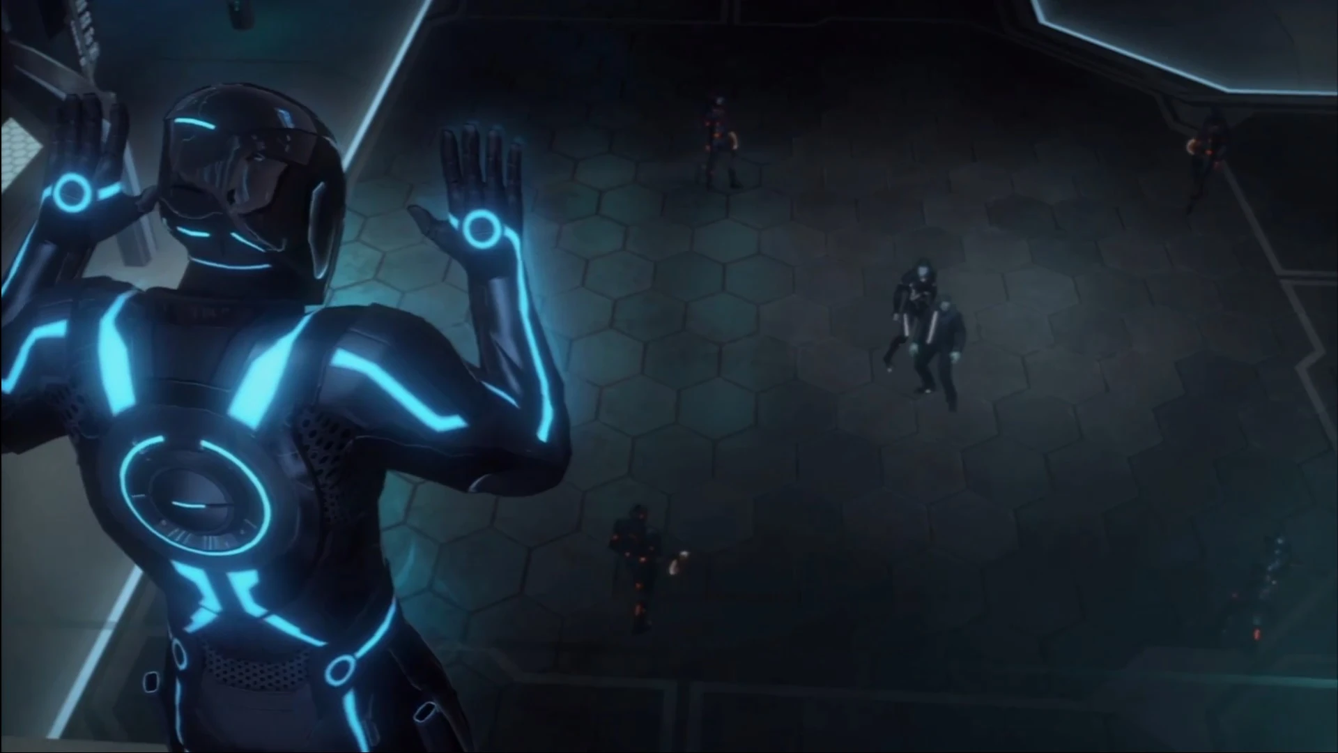 Realizing that Clu had declared war on the ISOs, Anon and Quorra decided to go to Arjia City, when they were attacked by a Black Guard, who Quorra recognized as one of the guards who attacked Tron. Anon barely escaped the quarantine zone, then exiting into a service tunnel, when dozens of Basics and ISOs came under attack from a Light Tank. Anon snuck behind, destroyed one, and rezzed in his own Light Tank, blasting through Recognizers, other Light Tanks, and sentries to reach the Solar Sailer Docks. Going through a service entrance, Anon set a line to Arjia City, where he and Quorra were bound. On the platform, however, they were ambushed by the Black Guard that had attacked them at the base of the End of Line Club. Anon defeated the Guard, allowing them to leave for Arjia City.