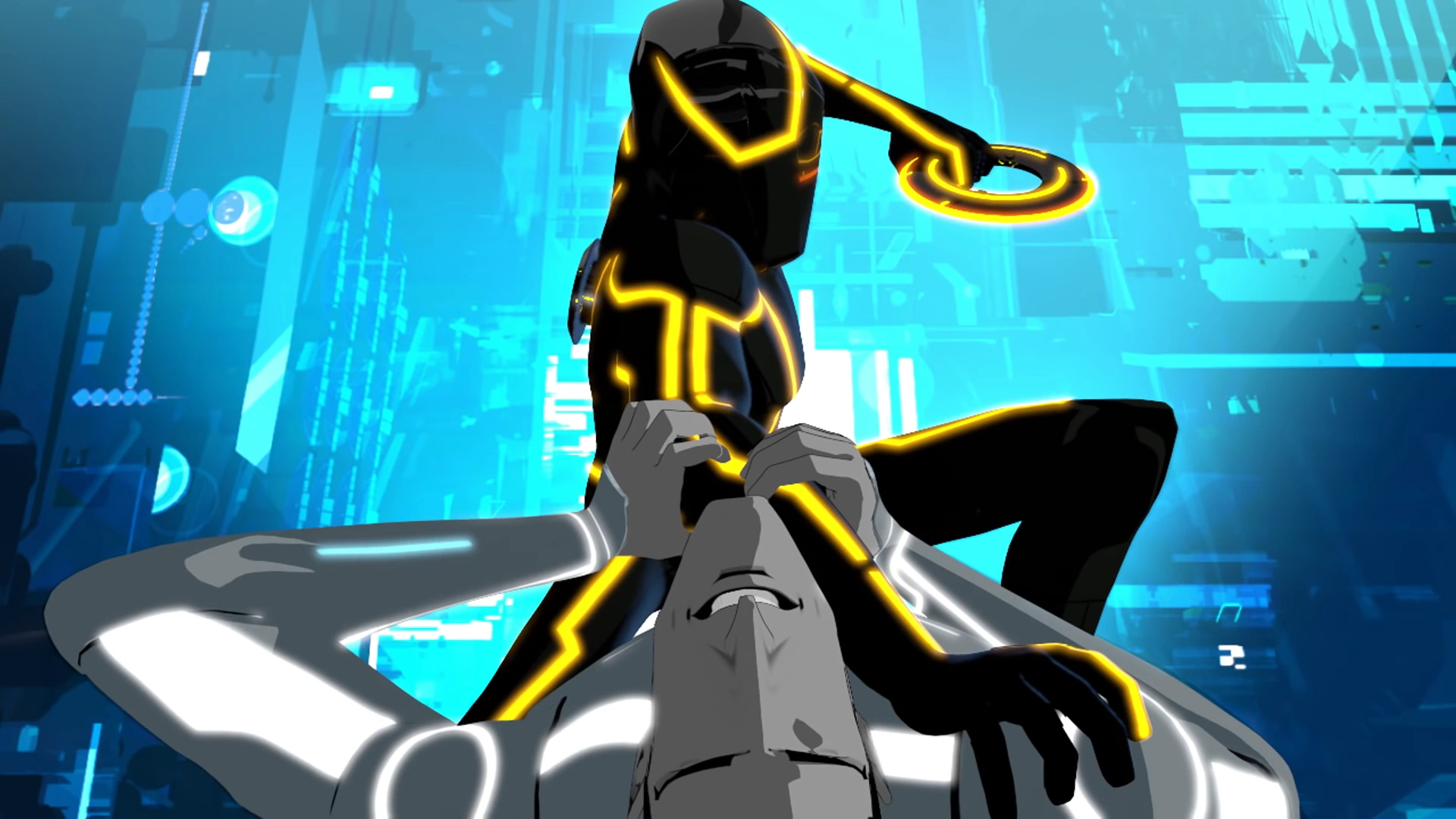 Quorra, a friend of Radia, attempted to kill Clu and ended up on his first carrier ship, the Regulator. Unfortunately, Quorra was captured by the Black Guard and brought to Clu, who was about to derez Quorra as they conversed, until Anon showed up and knocked his disc out of his hands.