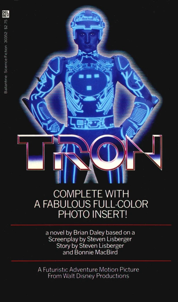 This novelization of TRON, written by Brian Daley and first published by Ballantine Books in 1982, was based on an early version of the screenplay by Steven Lisberger. The novel runs to 173 pages, and has a front cover portraying the titular character, Tron, against a black background, with the TRON logo superimposed on top. It also has an insert consisting of 8 pages of color photographs from the film.